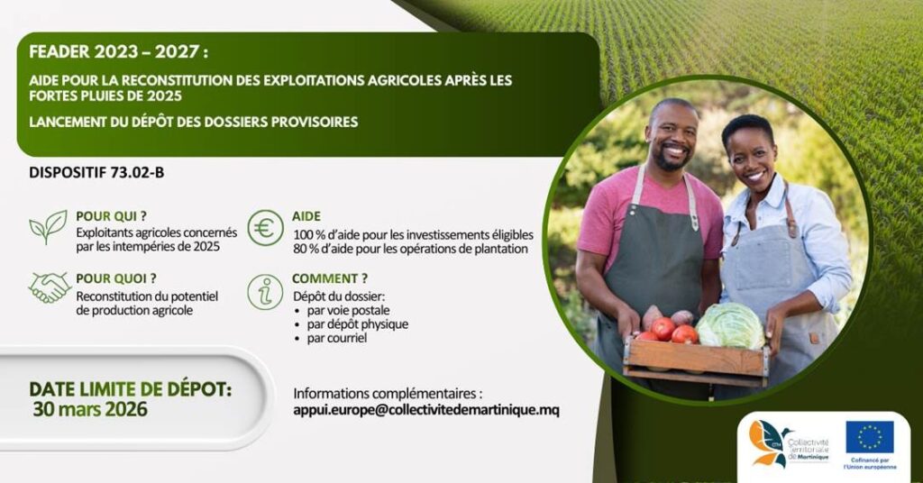 Suite à l’arrêté préfectoral du 20 juillet 2025, la Collectivité Territoriale de Martinique lance le dépôt des demandes d’aide provisoire du dispositif 73.02-B , dans le cadre du FEADER 2023–2027, à destination des exploitations agricoles touchées par les fortes pluies de 2025.